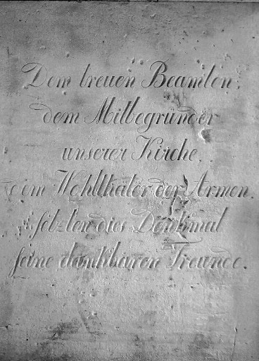 Dem treuen Beamten, dem Mitbegründer unserer Kirche, dem Wohltäter der Armen, setzten dies Denkmal seine dankbaren Freunde